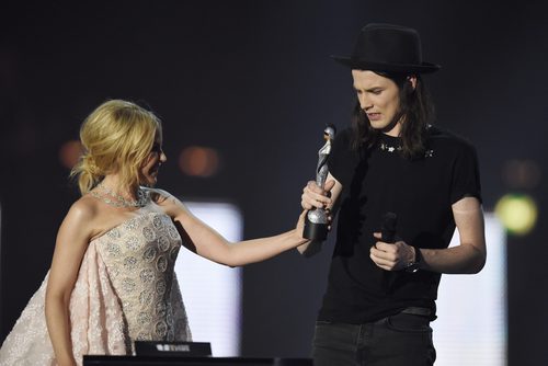 El cantante James Bay recoge su Premio Brit 2016 de manos de Kylie Minogue.