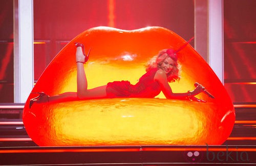 La cantante Kylie Minogue en el arranque de un concierto de su gira 'Kiss Me Once Tour'.