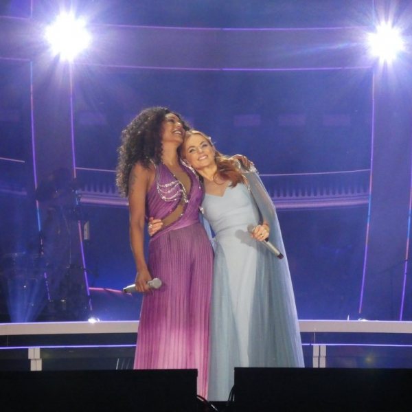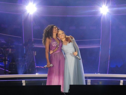 Mel B y Geri Halliwell abrazadas en el primer concierto de la gira Spice World Tour 2019 en la ciudad de Dublín, Irlanda.