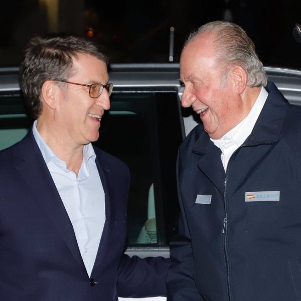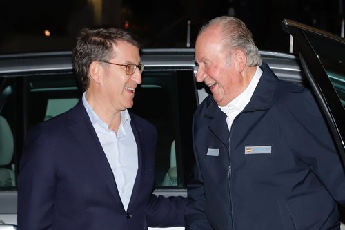 El Presidente de la Xunta de Galicia, Alberto Núñez Feijoó, junto al Rey Juan Carlos I a su llegada a una cena de autoridades políticas en Sanxenxo.