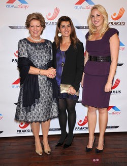 La Reina Ana María de Grecia y su hija la Princesa Teodora de Grecia y Dinamarca con la actriz Nia Vardalos en una gala benéfica en Los Angeles.