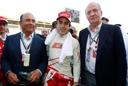 El banquero Emilio Botín, el corredor Fernando Alonso y el Rey Juan Carlos posando juntos en el Gran Premio de Fórmula 1 en 2010.
