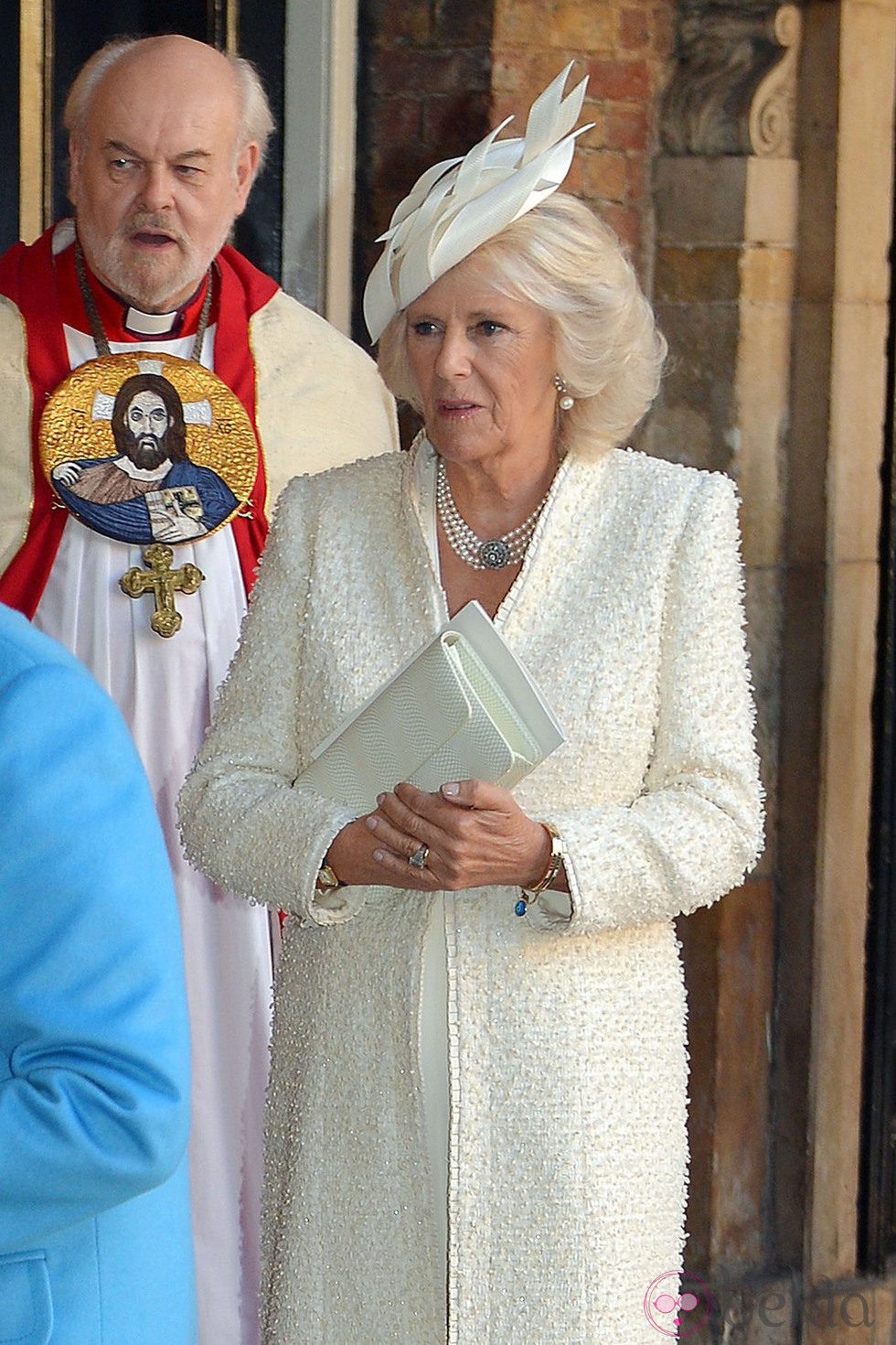 La Duquesa de Cornualles en el bautizo del Príncipe Jorge de Cambridge en el Palacio de St. James
