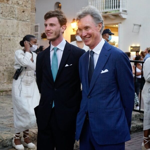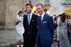 Guillermo de Luxemburgo y su hijo el Príncipe Paul-Louis de Luxemburgo en la boda del Príncipe Josef-Emanuel de Liechtenstein y Claudia Echavarría celebrada el 26 de marzo de 2022 en Cartagena de Indias.
