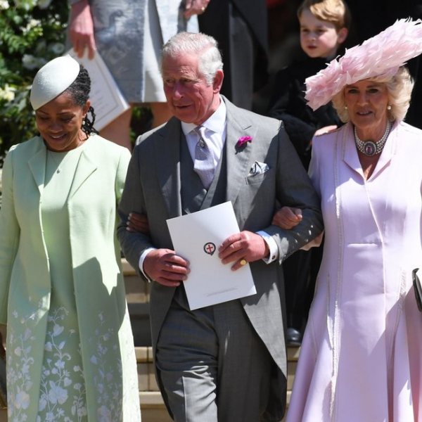 El Príncipe Carlos saliendo de la Capilla de San Jorge tras la boda del Príncipe Harry y Meghan Markle, acompañado de la Duquesa de Cornualles y Doria Ragland.