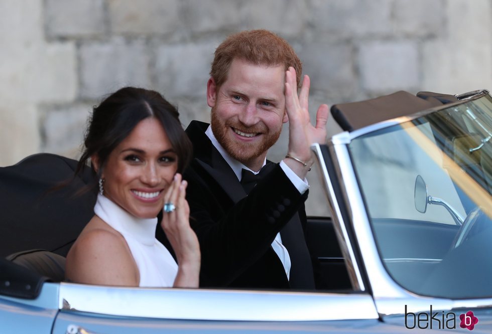 Primer plano del Príncipe Harry y Meghan Markle en dirección a Frogmore House, donde el Príncipe Carlos organizó una fiesta con motivo del enlace.