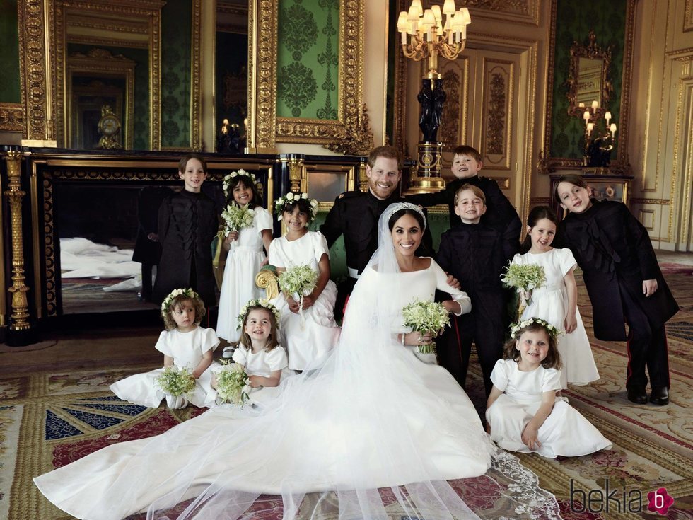 El Príncipe Harry y Meghan Markle posando rodeados de sus pajes y damitas en el Castillo de Windsor tras au boda. Entre ellos estaban los Príncipe Jorge y Carlota de Cambridge.