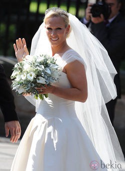 Zara Phillips saluda con su elegante vestido de novia el día de su boda.