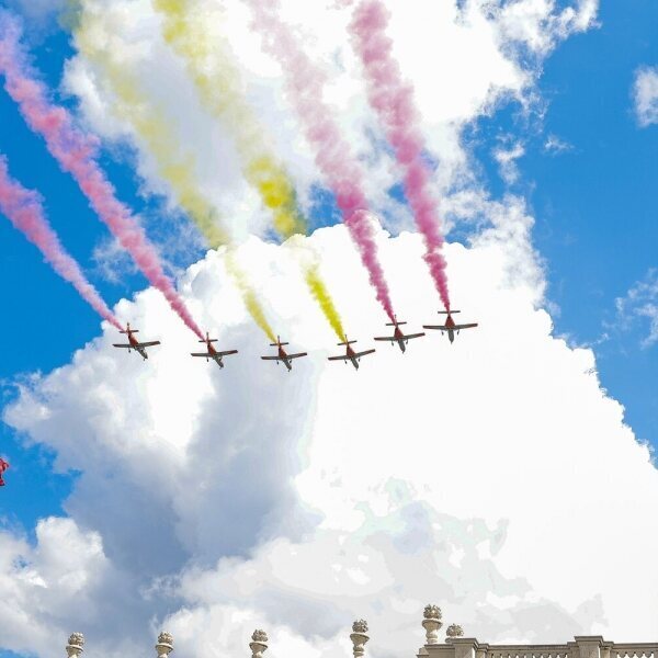 La Patrulla Águila del Ejército del Aire pintando la bandera de España en el cielo de Madrid en la celebración del décimo aniversario del reinado de Felipe VI.