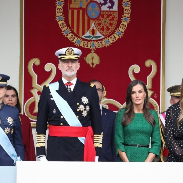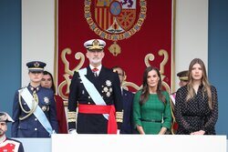 Los Reyes Felipe y Letizia, la Princesa Leonor y la Infanta Sofía son fotografiados presidiendo el desfile militar por el Día de la Hispanidad.