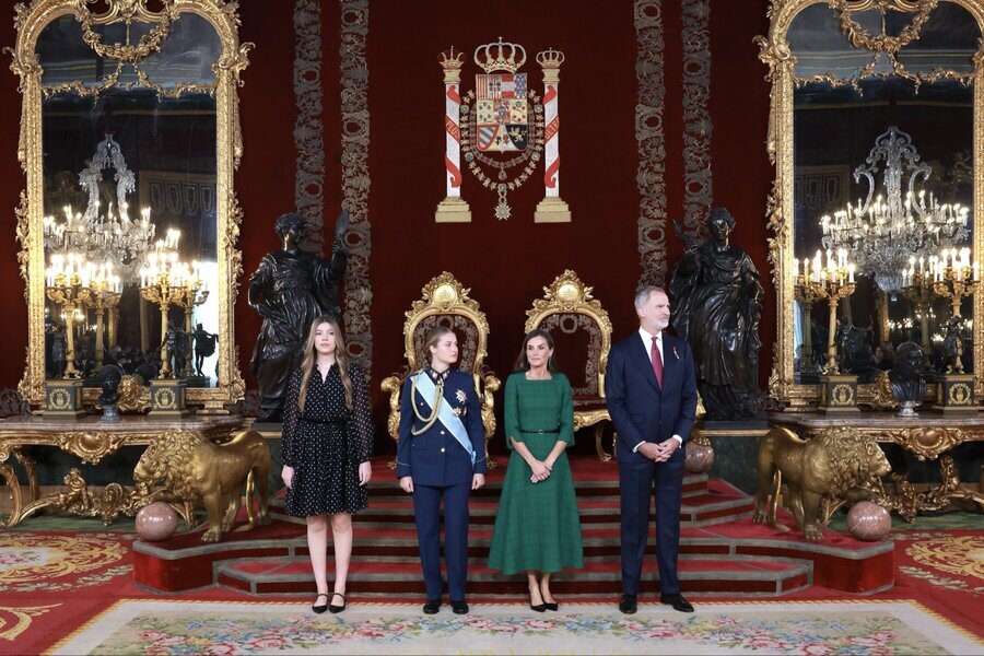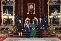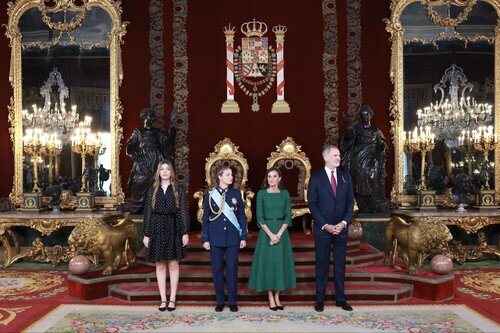 Los Reyes Felipe y Letizia, la Princesa Leonor y la Infanta Sofía son fotografiados durante la recepción en el Palacio Real por el Día de la Hispanidad.