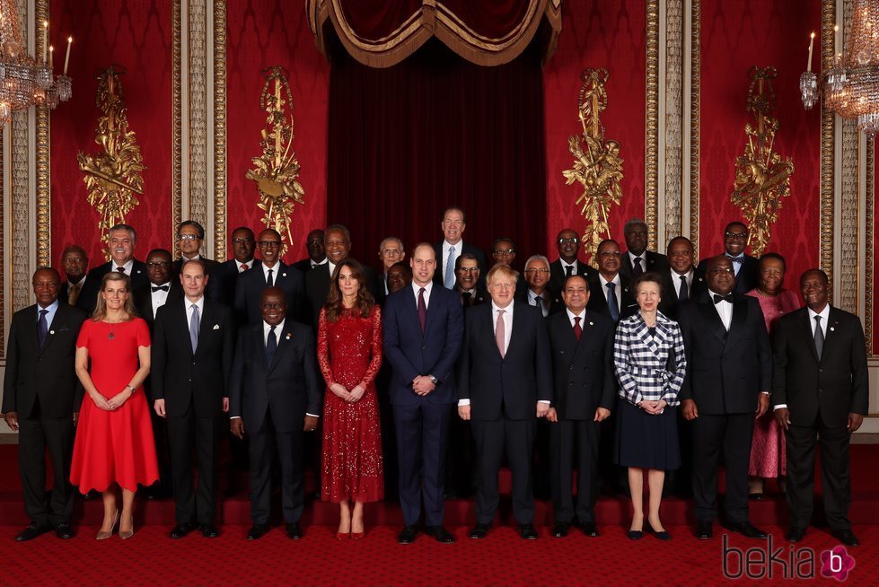 El Príncipe Guillermo y Kate Middleton, el Príncipe Eduardo y Sophie Rhys-Jones y la Princesa Ana con el Primer Ministro Británico, Boris Johnson, y líderes africanos en una recepción en Buckingham Palace con motivo de la Cumbre de Inversión Reino Unido-África.