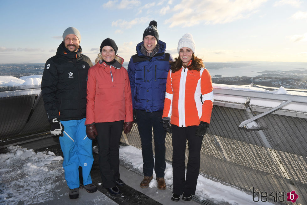 Los Duques de Cambridge y los Príncipes Haakon y Mette-Marit posan juntos durante su visita a las pistas de esquí de Noruega.