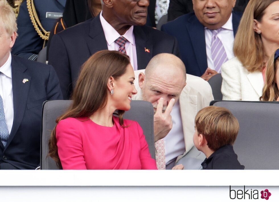Mike Tindall bromea con el Príncipe Louis de Cambridge en presencia de la Duquesa de Cambridge en el Platinum Jubilee Pageant, el Desfile por el Jubileo de Platino.