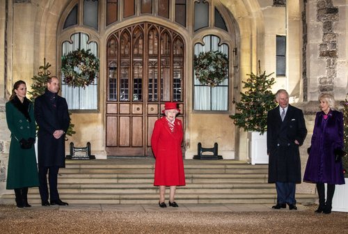 La Reina Isabel, el Príncipe Carlos y Camilla Parker, el Príncipe Guillermo y Kate Middleton en un encuentro con voluntarios y trabajadores esenciales en W