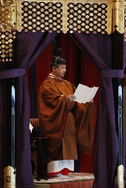 El Emperador Naruhito de Japón leyendo un discurso en los actos de entronización como Emperador de Japón en Tokio.