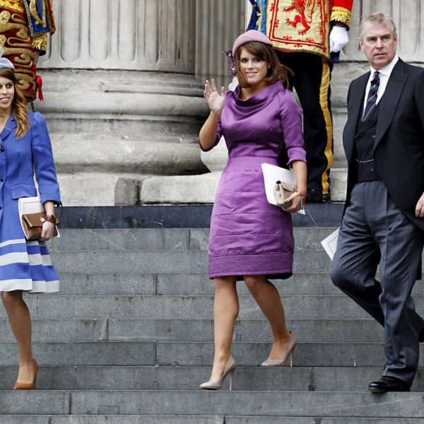El Príncipe Andrés de Inglaterra y sus hijas las Princesas Beatriz y Eugenia de York a la salida de la misa de acción de gracias celebrada en la Catedral de St Paul con motivo del Jubileo de Diamante.