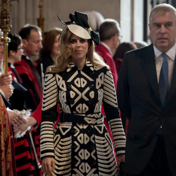 La Princesa Beatriz de York y el Duque Andrés de York en la misa por el 90 cumpleaños de la Reina Isabel II de Inglaterra y por el 95 cumpleaños del Duque de Edimburgo en junio de 2016.