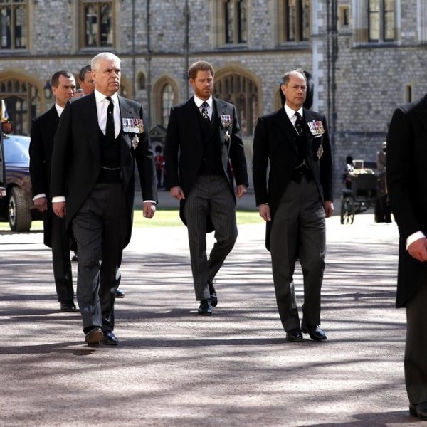 El Príncipe Carlos encabeza el cortejo fúnebre del funeral del Duque de Edimburgo y le siguen el Príncipe Carlos, el Príncipe Eduardo, el Príncipe Harry, el Príncipe Guillermo y el Príncipe Andrés.