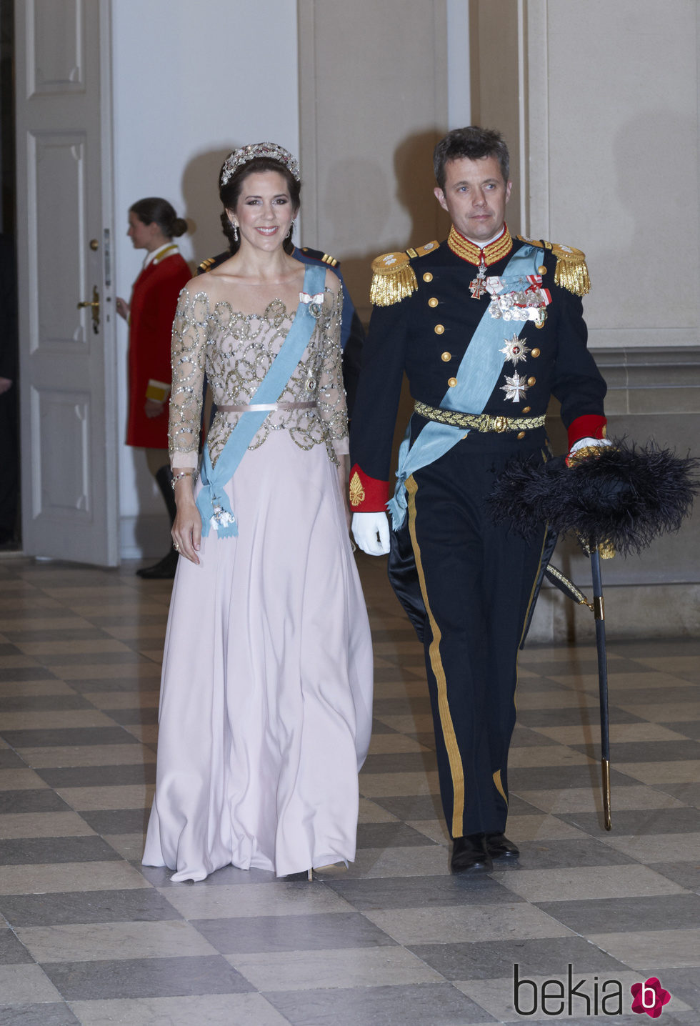 Los Príncipes Federico y Mary de Dinamarca en la cena de gala por el 75 cumpleaños de la Reina Margarita de Dinamarca.