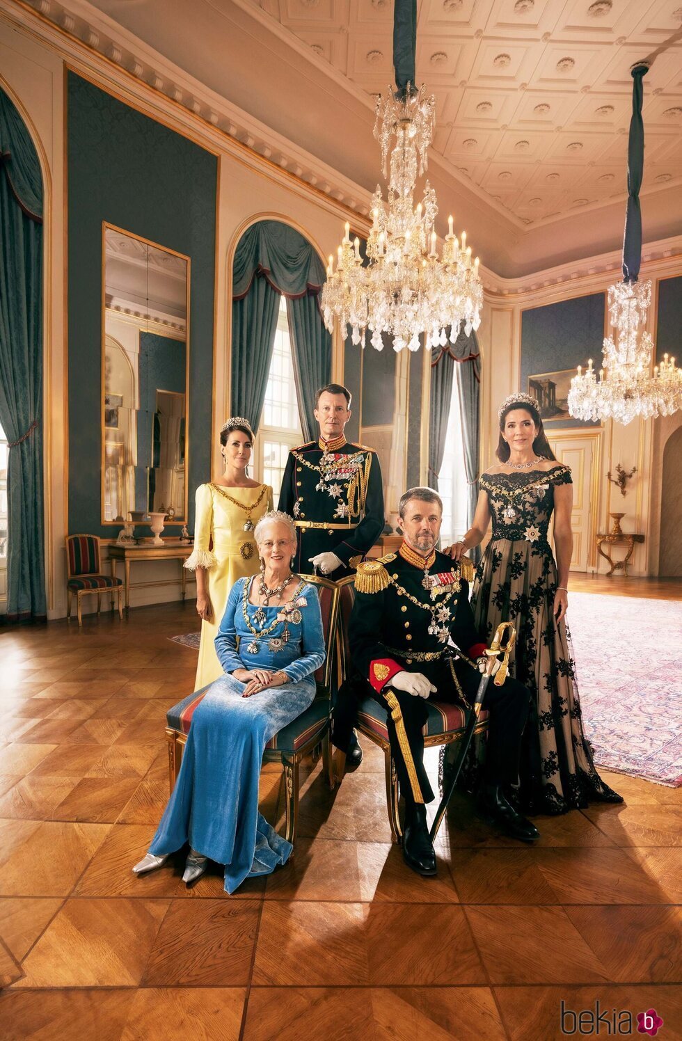 Foto oficial de Margarita de Dinamarca, Federico y Mary de Dinamarca y Joaquín y Marie de Dinamarca por el 50 aniversario de reinado de Margarita de Dinama