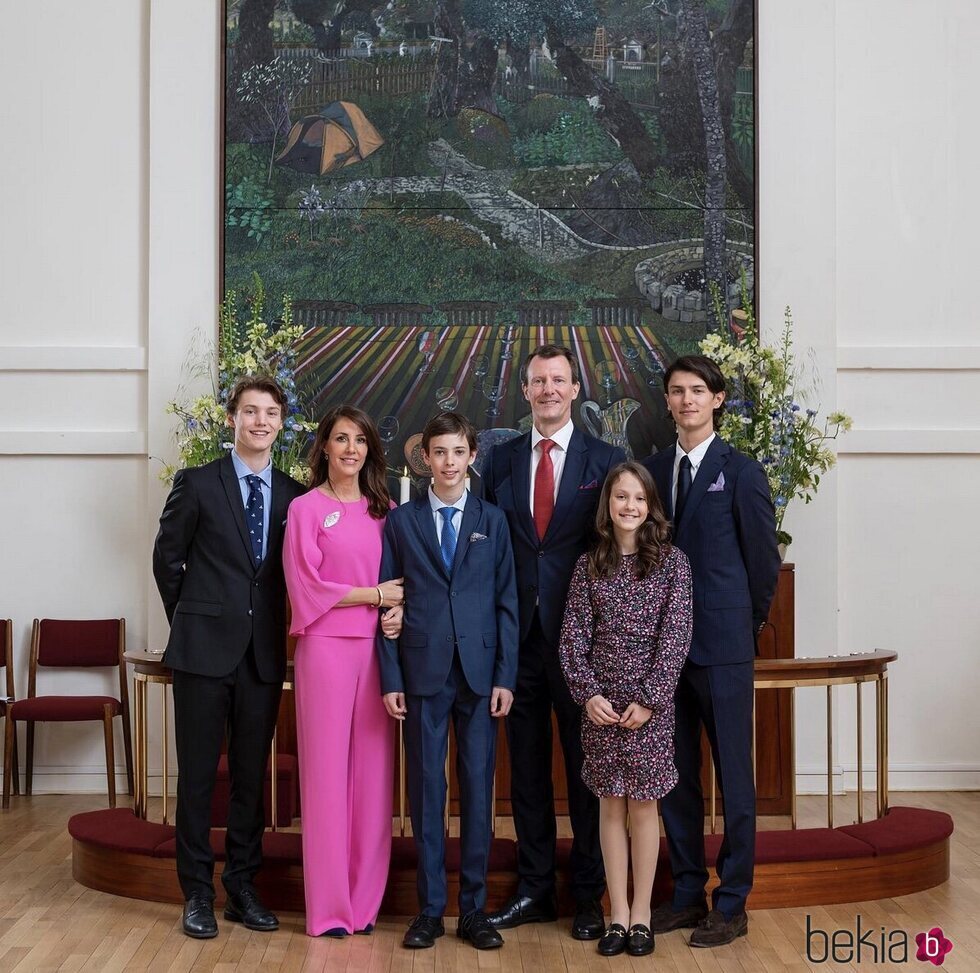 Los Príncipes Joaquín y Marie de Dinamarca, el Conde Nikolai de Monpezat, el Conde Felix de Monpezat, el Conde Henrik de Monpezat y la Condesa Athena de Monpezat en la Confirmación de Henrik de Dinamarca en la Frederikskirken de París.