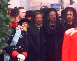 El Príncipe Federico, la Reina Ana María de Grecia, la Reina Margarita de Dinamarca y la Princesa Benedicta en el funeral de la Reina Ingrid de Dinamarca.