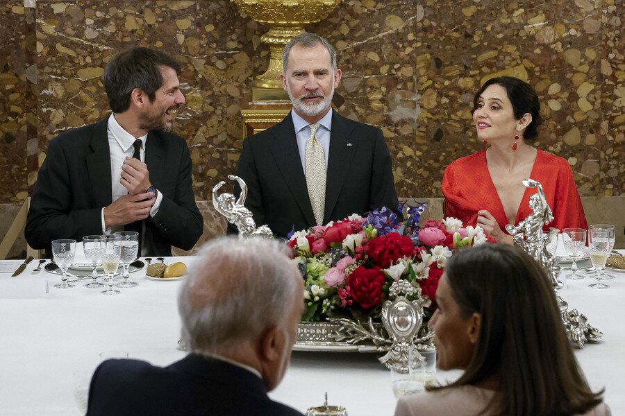 El Ministro de Cultura, Ernest Urtasun, el Rey Felipe VI y la Presidenta de la Comunidad de Madrid, Isabel Díaz Ayuso, en el almuerzo ofrecido a una representación del Mundo de las Letras por la entrega el Premio Cervantes 2023 en el Palacio Real.