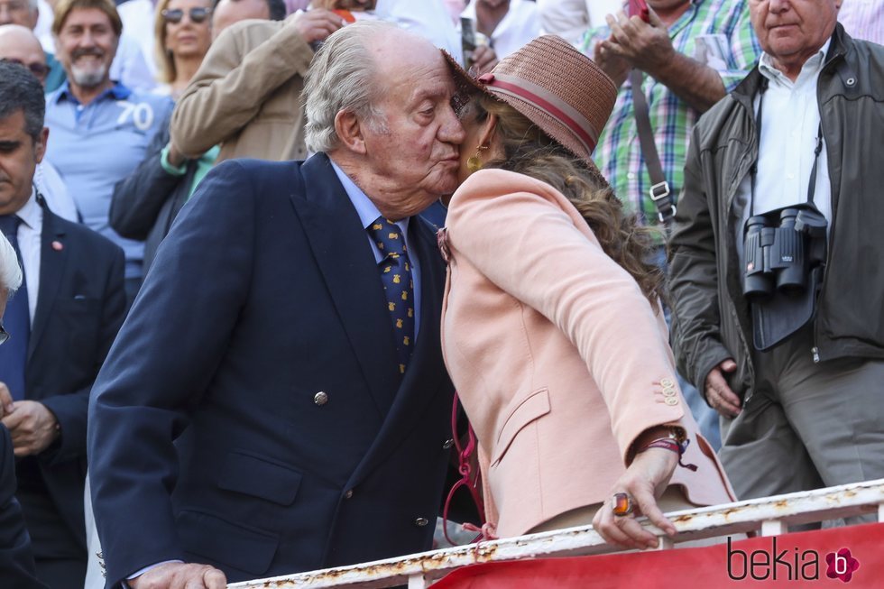La Infanta Elena dando un beso al Rey Juan Carlos en una corrida de toros correspondiente a la Feria de San Isidro 2019.