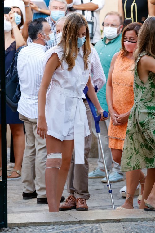 La Infanta Sofía con una muleta debido a una lesión en la rodilla durante su visita a Petra al inicio de sus vacaciones en Mallorca.