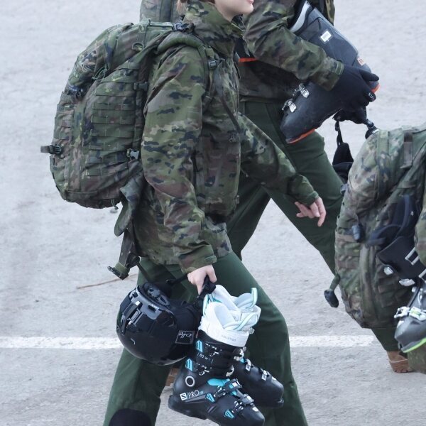 La Princesa Leonor con uniforme militar durante su paso por la Escuela Militar de Montaña y Operaciones Especiales en la estación de Candanchú y la instrucción de esquí en Astún como parte de su formación militar en la Academia de Zaragoza.