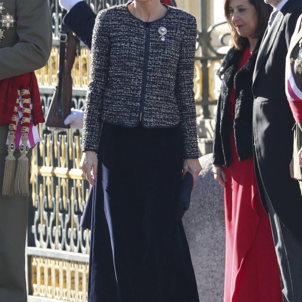 La Reina Letizia luciendo un conjunto del diseñador Felipe Varela durante la celebración de la Pascua Militar 2019.