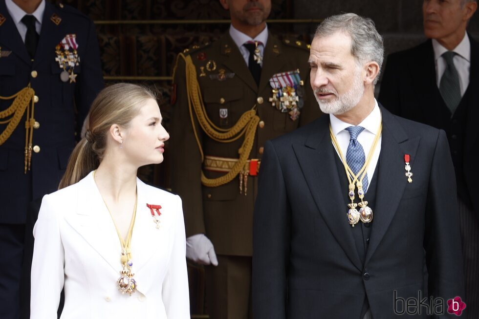 El Rey Felipe habla con la Princesa Leonor a las afueras del Congreso tras la Jura de la Constitución por su 18 cumpleaños.