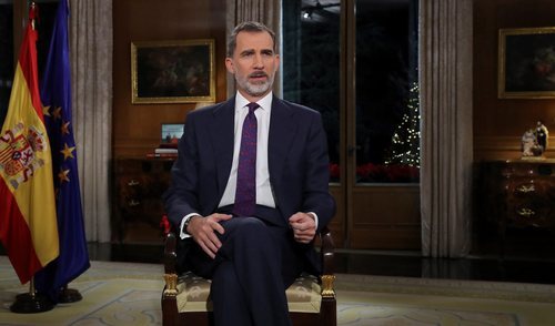 El Rey Felipe VI es fotografiado en uno de los salones de la Zarzuela dando el mensaje de Navidad de cada año.