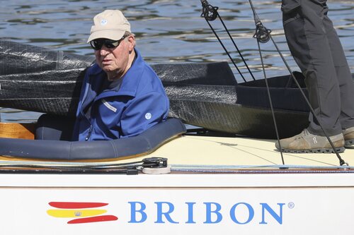 El Rey Juan Carlos con gorra y gafas de sol a bordo del Bribón durante su paso por las regatas de Sanxenxo en septiembre de 2024.