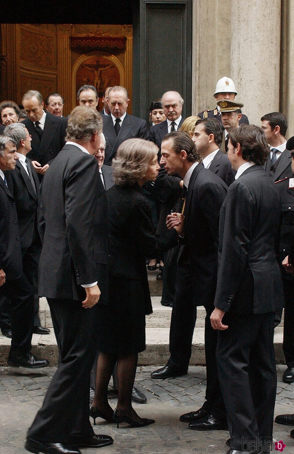 Los Reyes Juan Carlos y Sofía con su sobrino Alessandro Lequio en el funeral de la Infanta Beatriz en Roma en el año 2002.