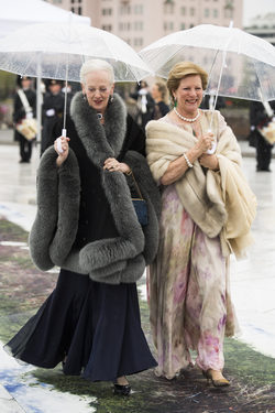 Las reinas y hermanas Margarita de Dinamarca y Ana María de Grecia a su llegada a la cena celebrada en la Ópera de Oslo con motivo del 80 cumpleaños de los Reyes Harald y Sonia de Noruega.