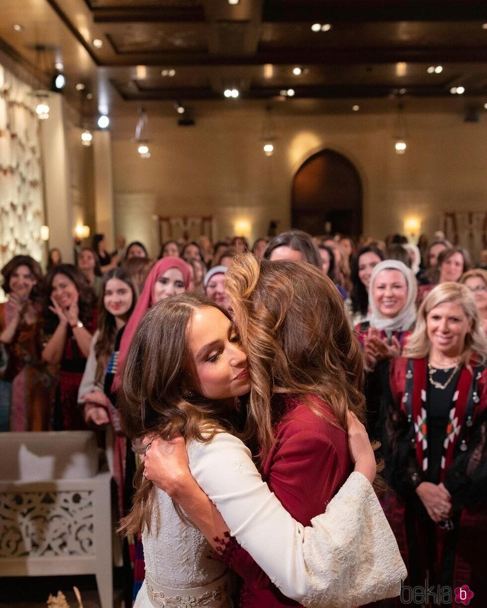 La Princesa Iman de Jordania y la Reina Rania de Jordania dándose un abrazo en la fiesta de henna de Iman de Jordania previa a su boda.