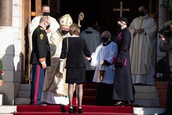 Alberto y Charlene de Mónaco y la Princesa Carolina de Mónaco a su llegada al Te Deum en la Catedral de Mónaco con motivo del Día Nacional de Mónaco 2020.