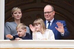 Los Príncipes Alberto y Charlene de Mónaco y sus hijos, el Príncipe Jacques de Mónaco y la Princesa Gabriella de Mónaco, saludando desde el balcón del Palacio Grimaldi en el 66 cumpleaños de Alberto de Mónaco.