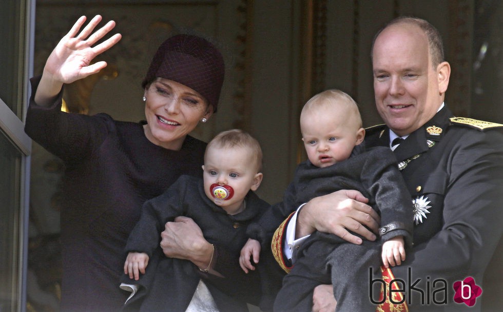 Los Príncipes de Mónaco con sus hijos los Príncipes Jacques y Gabriella en la celebración del Día Nacional de Mónaco 2015.