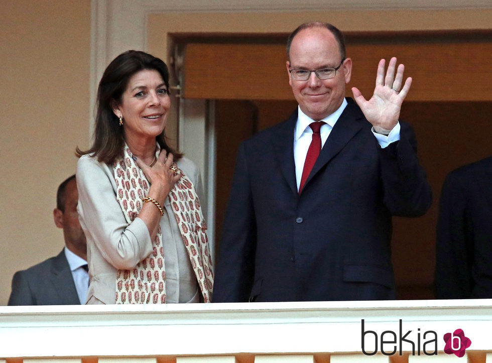 La Princesa de Hannover y el Príncipe Alberto II saludan desde el Palacio Grimadi en la Noche de San Juan.