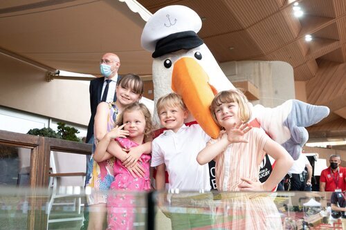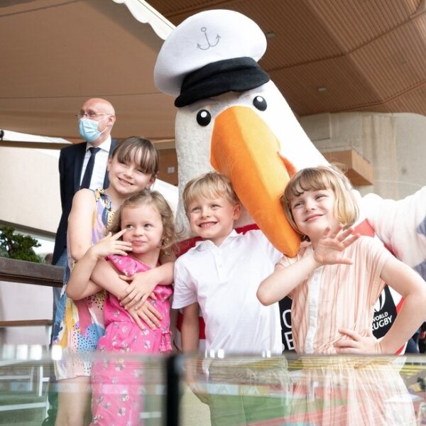 El Príncipe Jacques y la Princesa Gabriella de Mónaco con sus primas Kaia Rose y Bodhi Wittstock junto a la mascota del World Rugby Sevens Repechage.