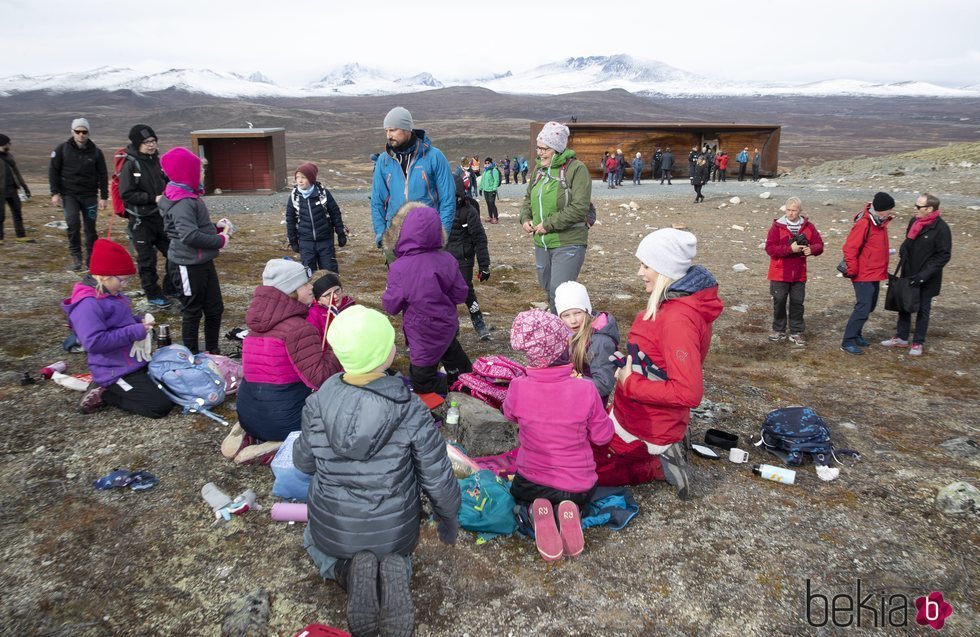 El Príncipe Haakon y la Princesa Mette-Marit de Noruega con unos niños en Hjerkinn durante su visita oficial a Oppland.