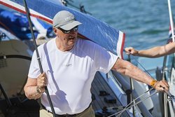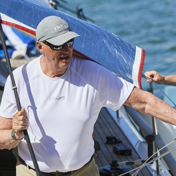 El Rey Harald de Noruega a bordo del barco Fram VIII durante las regatas de la Copa del Rey de Vela de Mallorca.