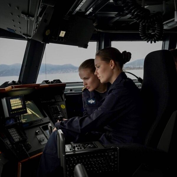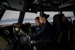 La Princesa Ingrid Alexandra de Noruega recibe explicaciones de un miembro de la Marina durante su visita a la Armada Noruega el 20 de octubre de 2022.