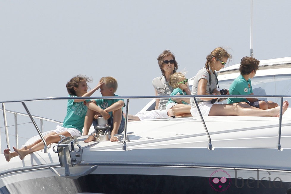 Victoria juega con su primo Miguel, la Reina Sofía cuida de su nieta Irene y la Infanta Elena con su hijo Felipe en la primera regata de la Copa del Rey de Vela 2011.