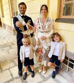 Los Príncipes Carlos Felipe y Sofia de Suecia posan con sus hijos Alejandro, Gabriel y Julian en el bautizo de Julian de Suecia.
