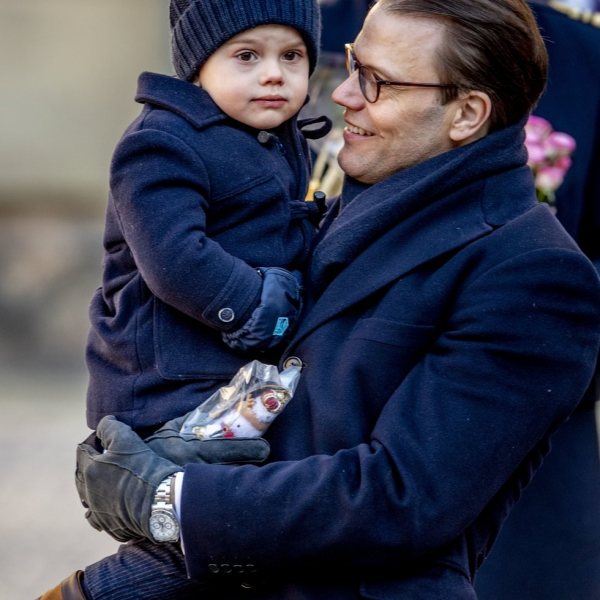 El Príncipe Daniel de Suecia con su hijo pequeño, el Príncipe Oscar, en el Día del Nombre en honor a Victoria de Suecia.
