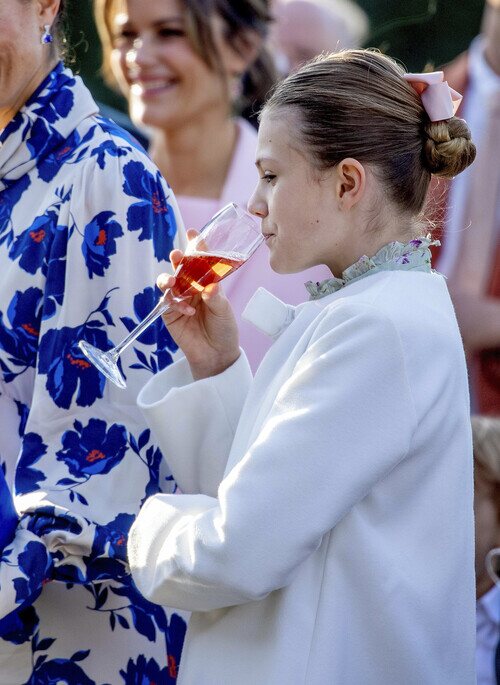 La Princesa Estelle de Suecia tomando una bebida en el concierto por el Jubileo del Rey Carlos XVI Gustavo de Suecia, que cumplió 50 años en el trono.